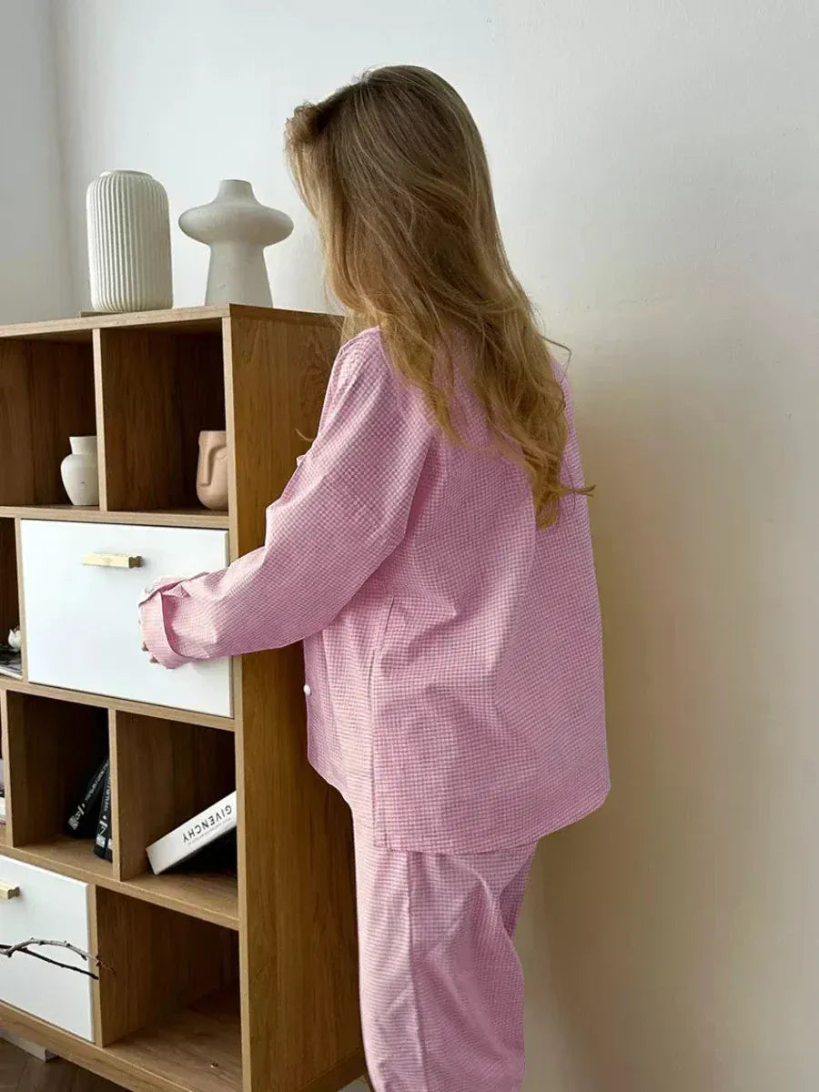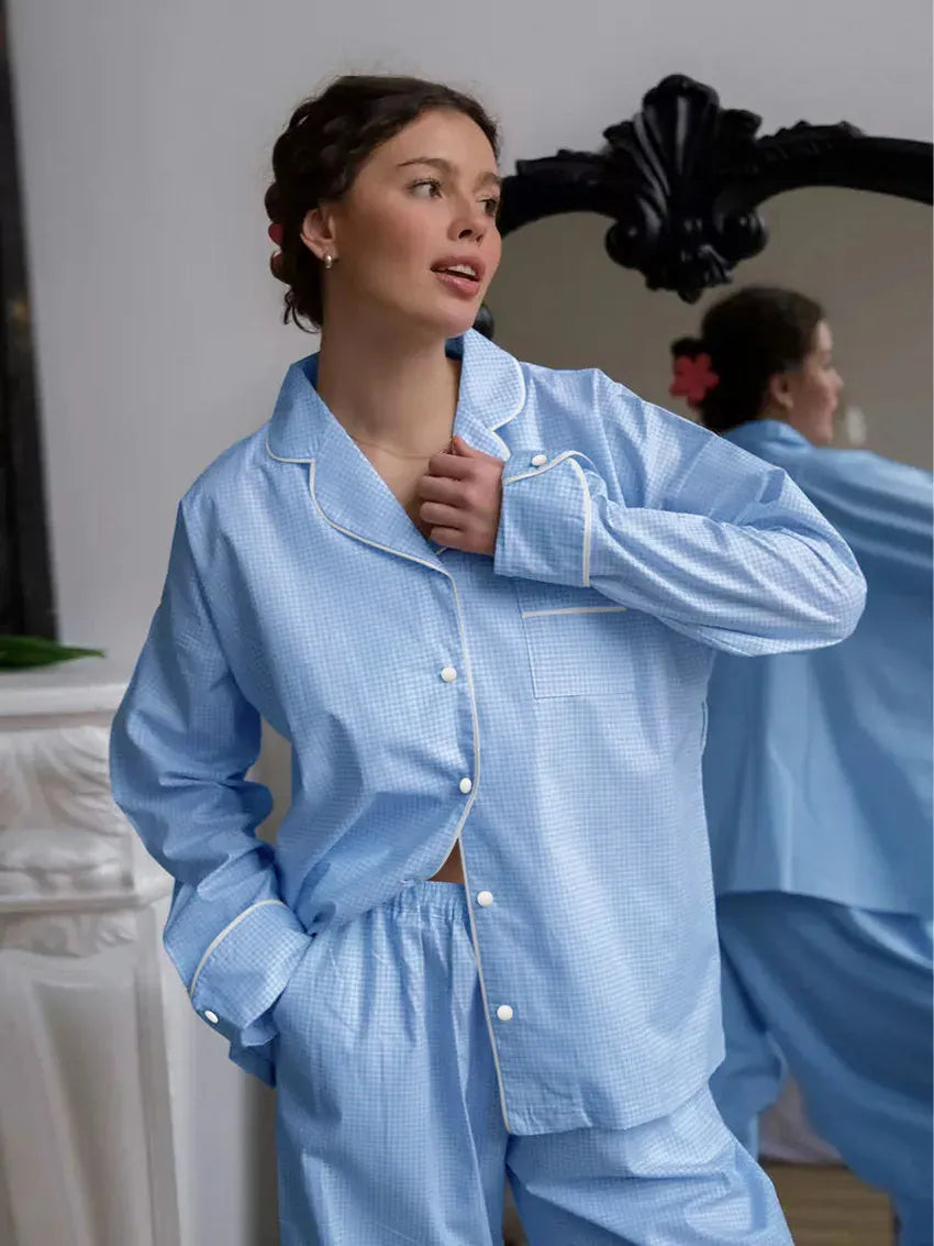 - Piżama: koszula, szerokie spodnie - Odzież domowa - Motyw kratki - Głęboka kieszeń w koszuli - 2 warianty kolorystyczne