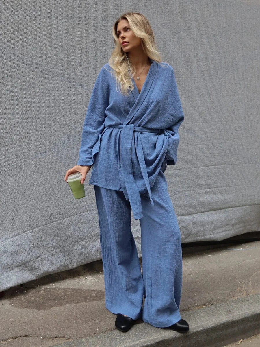 - Komplet: koszula, spodnie - Luźna koszula wiązana w pasie - Szerokie spodnie - Materiał: Bawełna