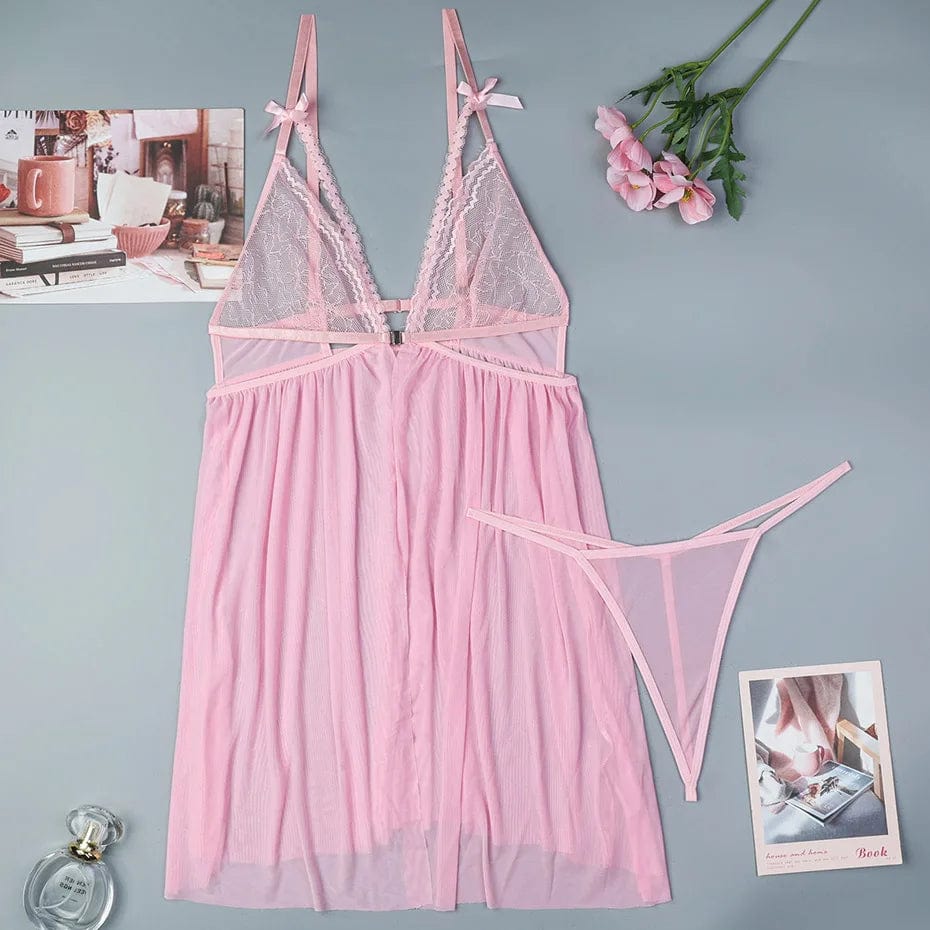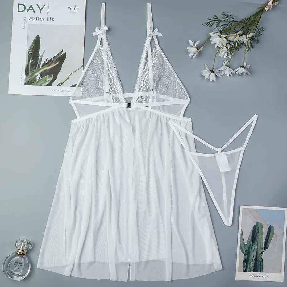 - Komplet: koszula, majtki - Majtki typu stringi - Wycięcia pod biustem - Pełna regulacja - Zapięcie z tyłu - 3 warianty kolorystyczne