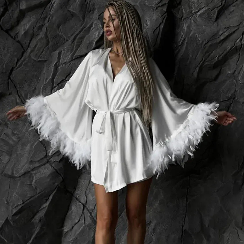 Satynowy komplet piżamowy z szlafrokiem z piór