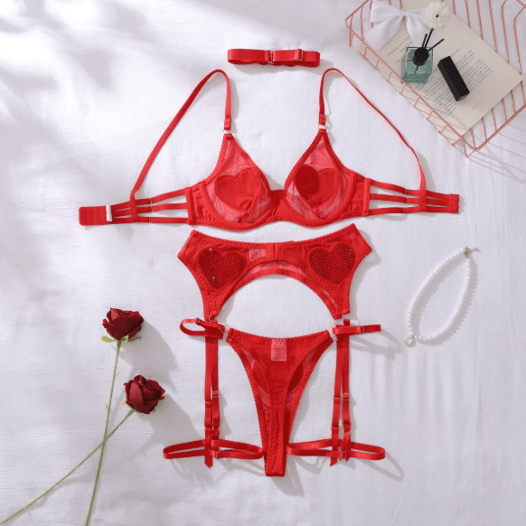 - Komplet: choker, biustonosz, pas, majtki, podwiązki - Przezroczysty materiał- Motyw serc - Pełna regulacja