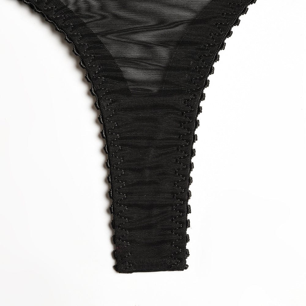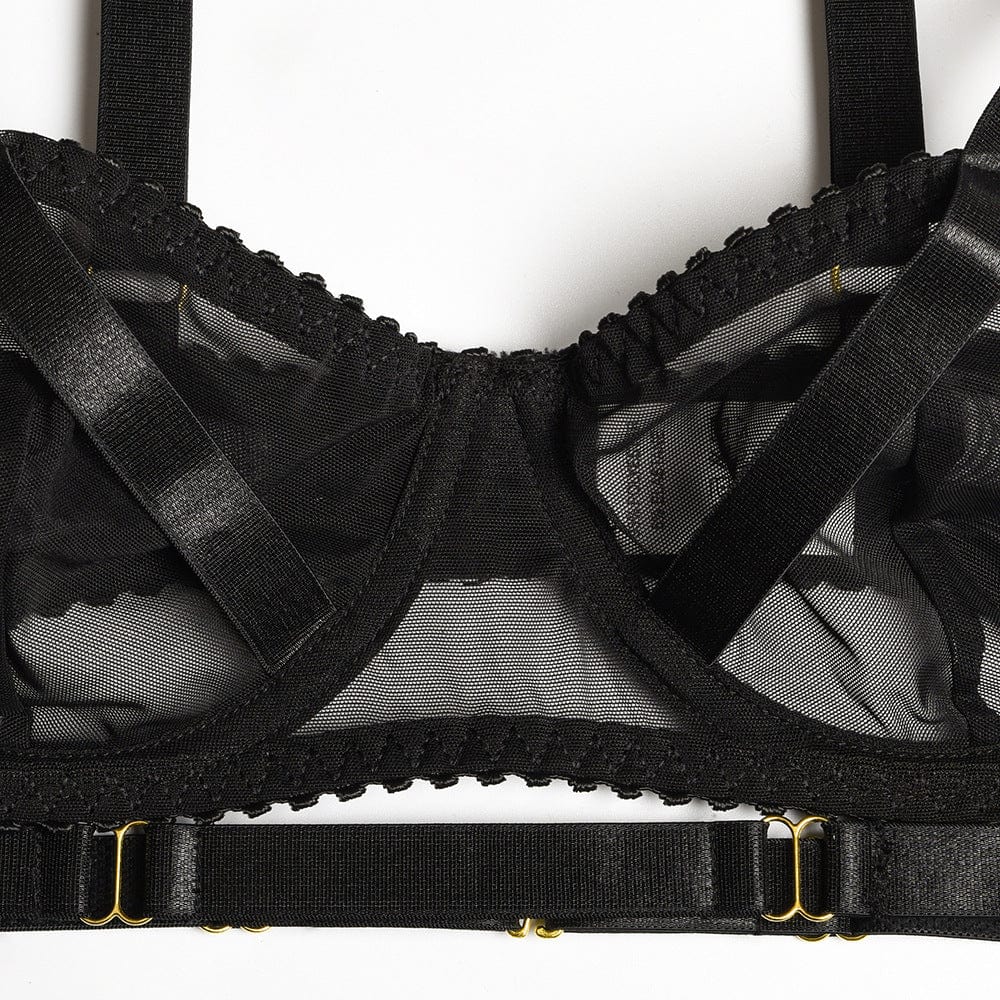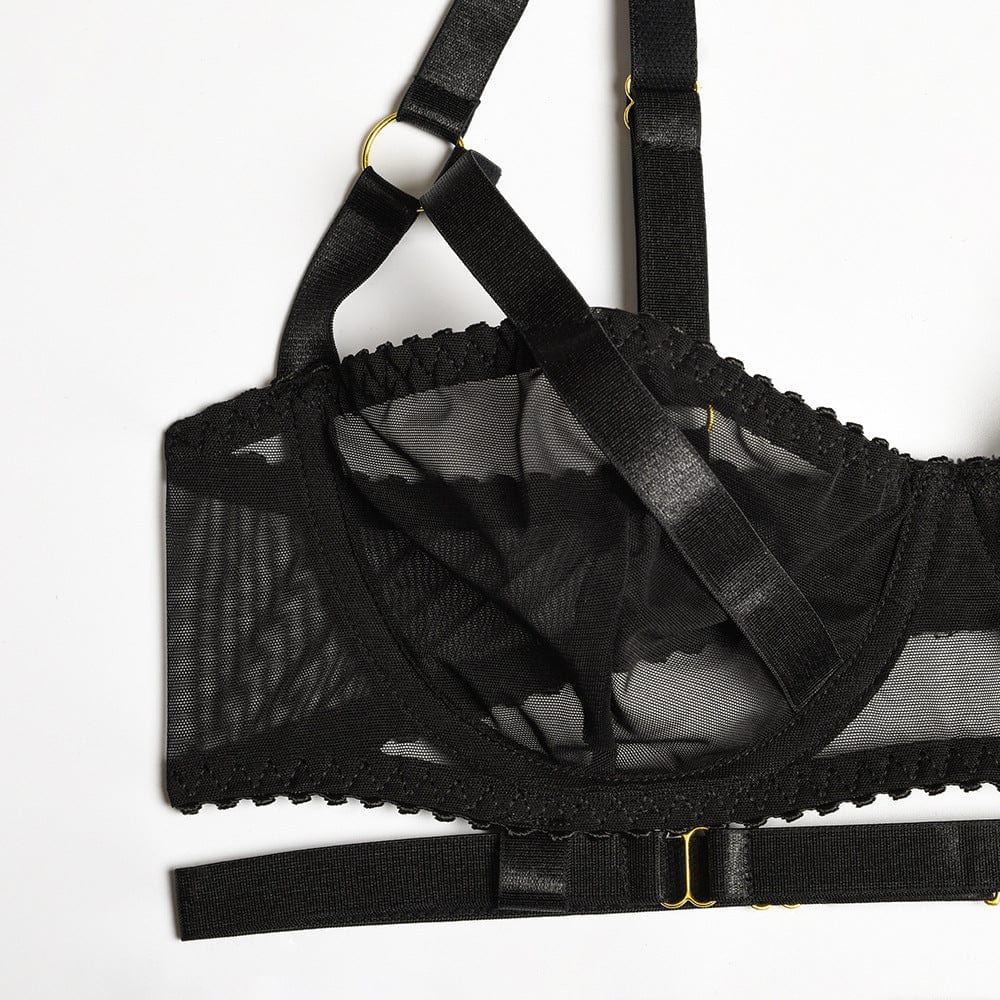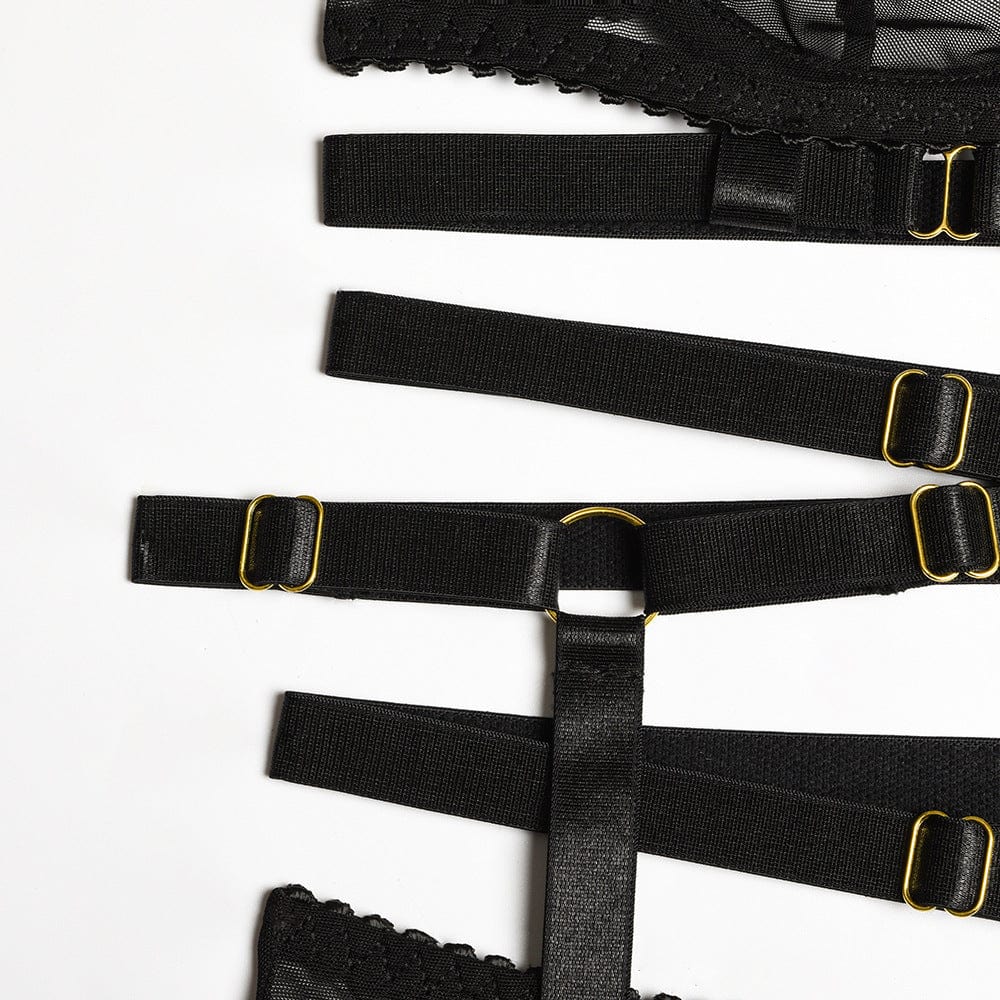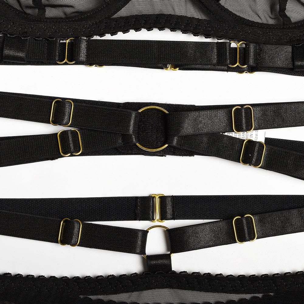 - Komplet: biustonosz, pas do pończoch, stringi - Siateczkowy, prześwitujący materiał - Pasy na piersi i uda - Fiszbiny podtrzymujące biust - Regulowany biustonosz oraz pas - 2 kolory do wyboru
