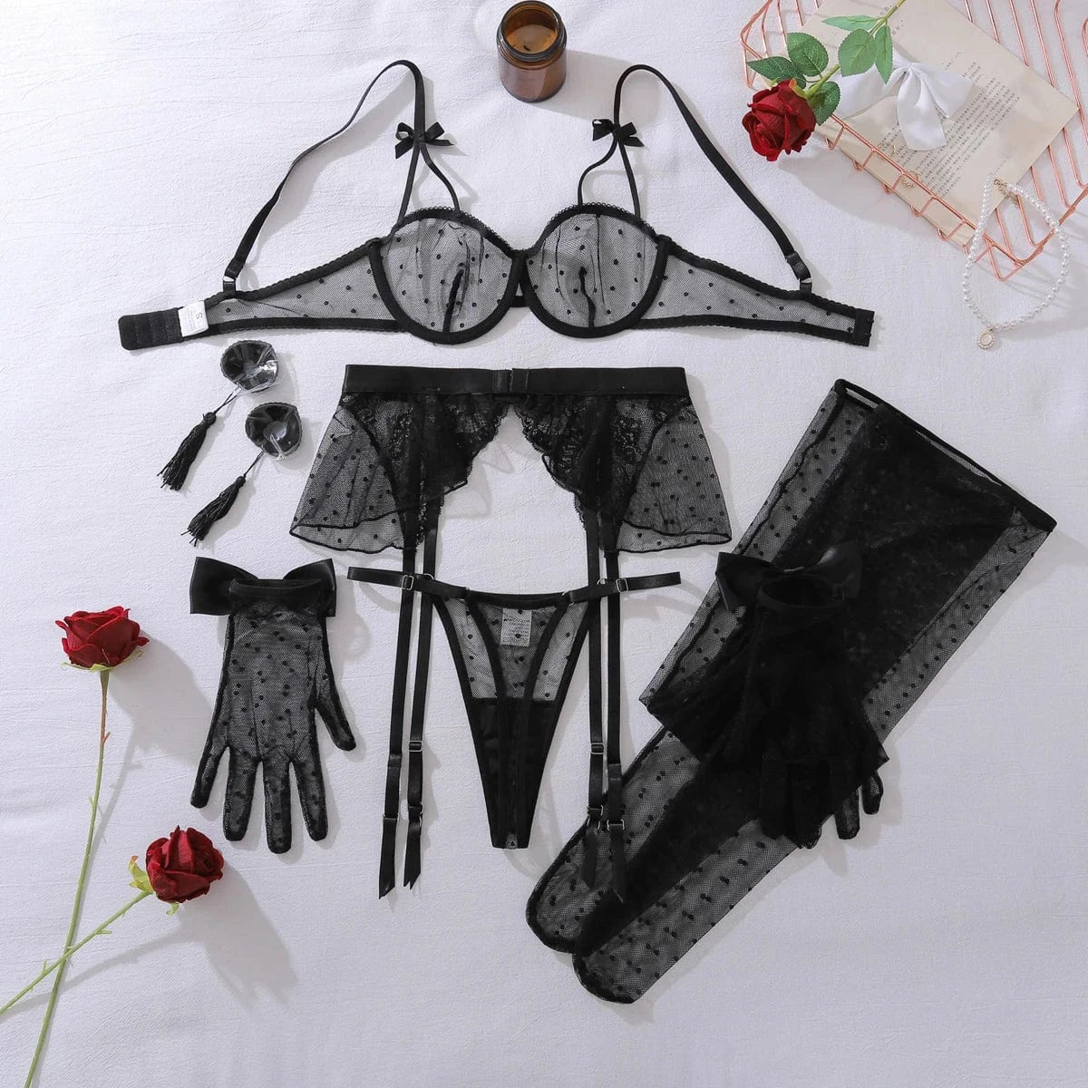 - Komplet: biustonosz, majtki, pas do pończoch, pończochy i rękawiczki