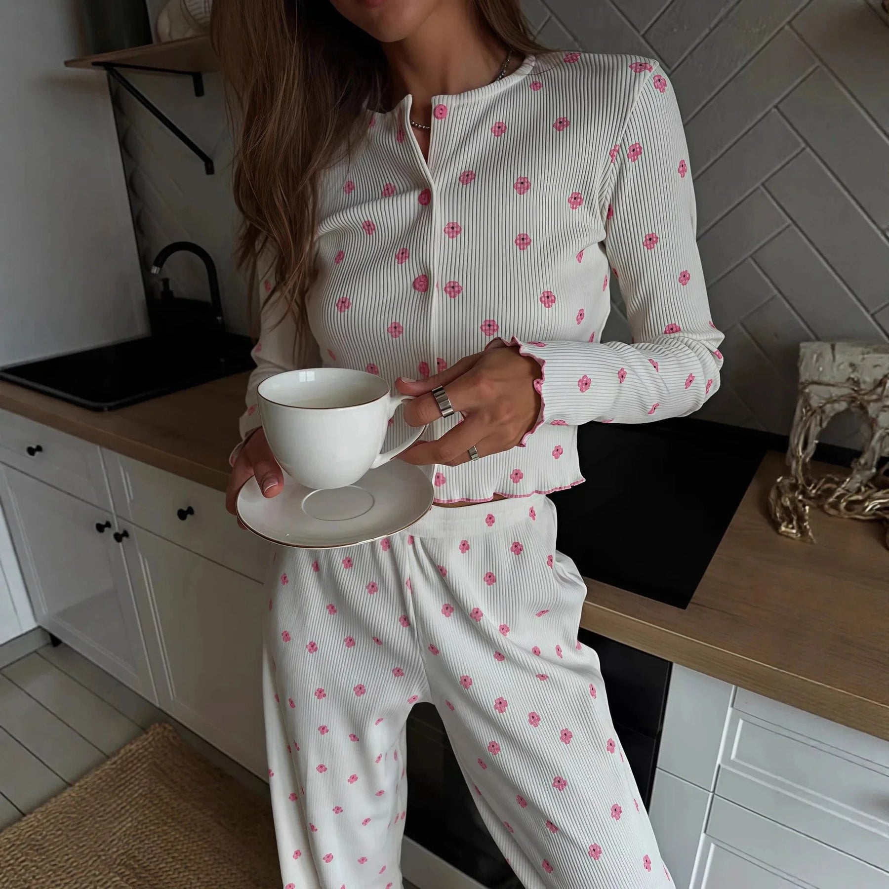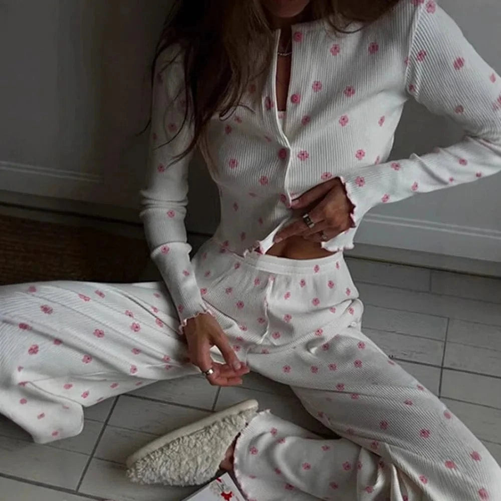 Piżama z prążkowanej dzianiny z różowymi kwiatami